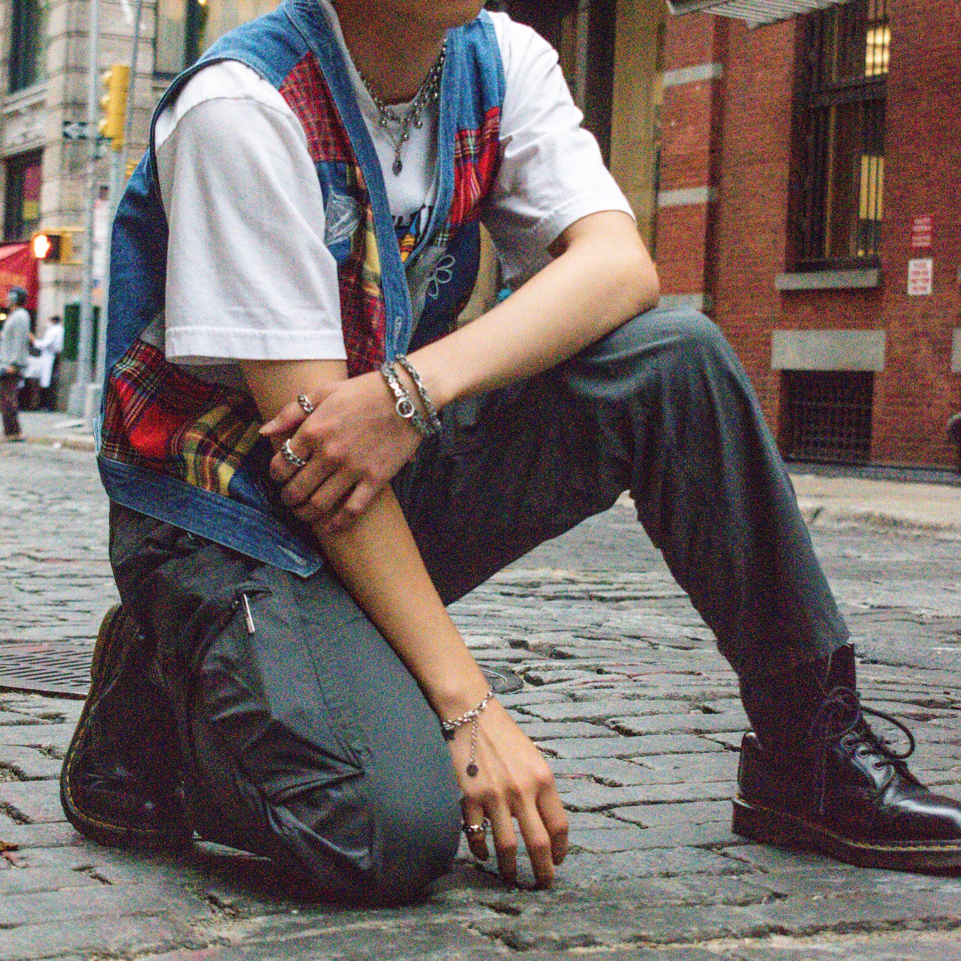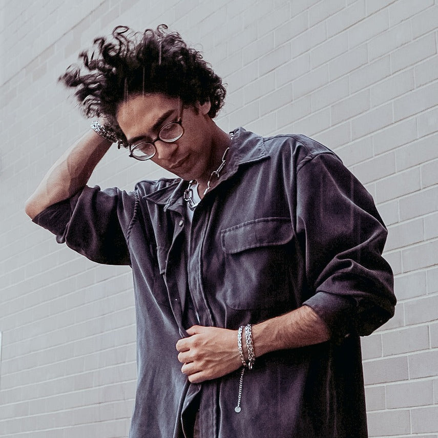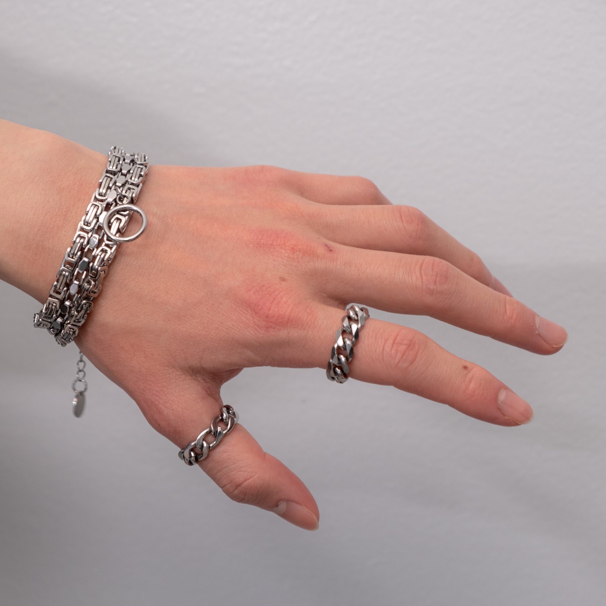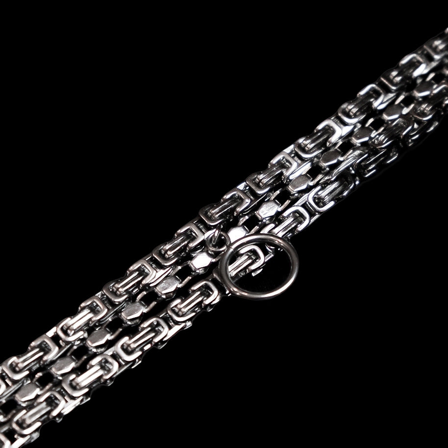 An artistic reimagination of how handcuffs would look like in a mechanical dream. A unique silhouette featuring a triple layered construction of Venetian and Byzantine Chains, finished off with a center ring. Made in collaboration with Shannon N. Vandy, a talented fashion photographer based in New York.