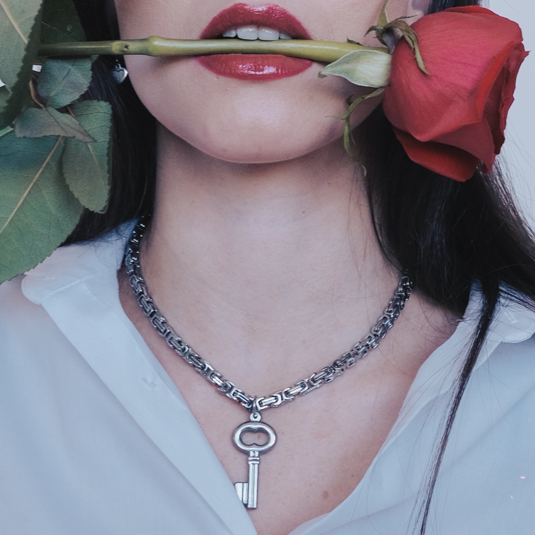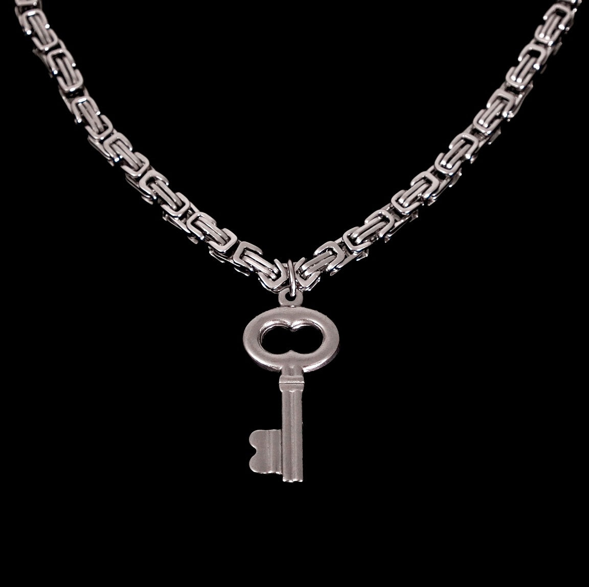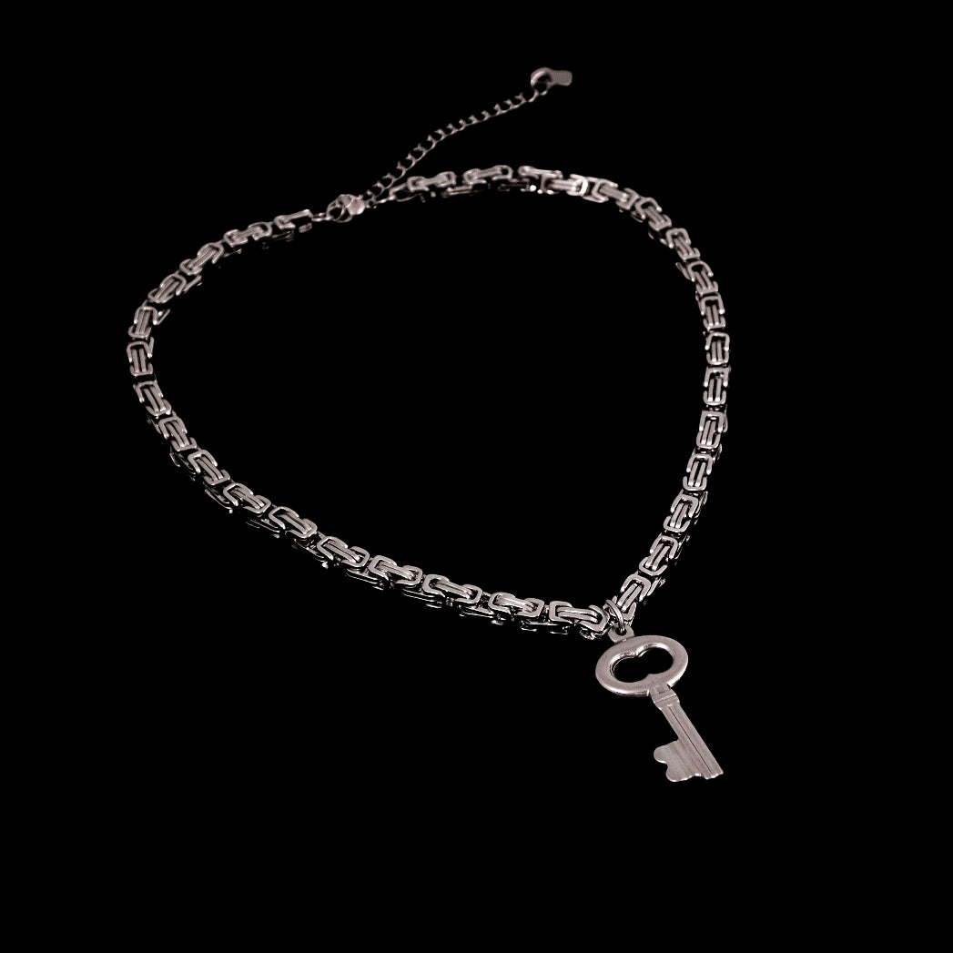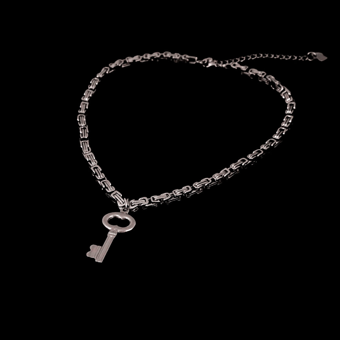 Introducing one of the must-have pieces from the Lock Hearts collection. This chunky, oversized key pendant is suspended on an intricate byzantine chain, symbolizing the complexities of unlocking one's heart. Will you trust someone special with the key to yours?