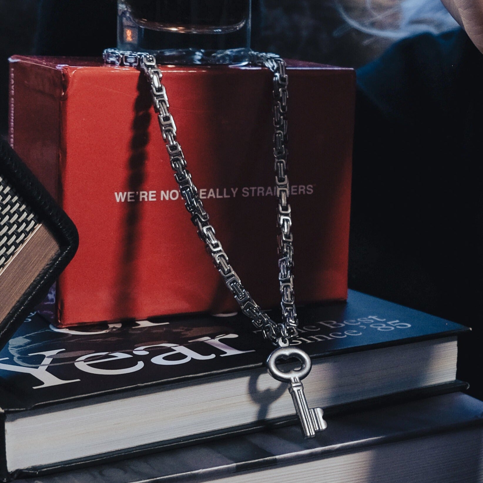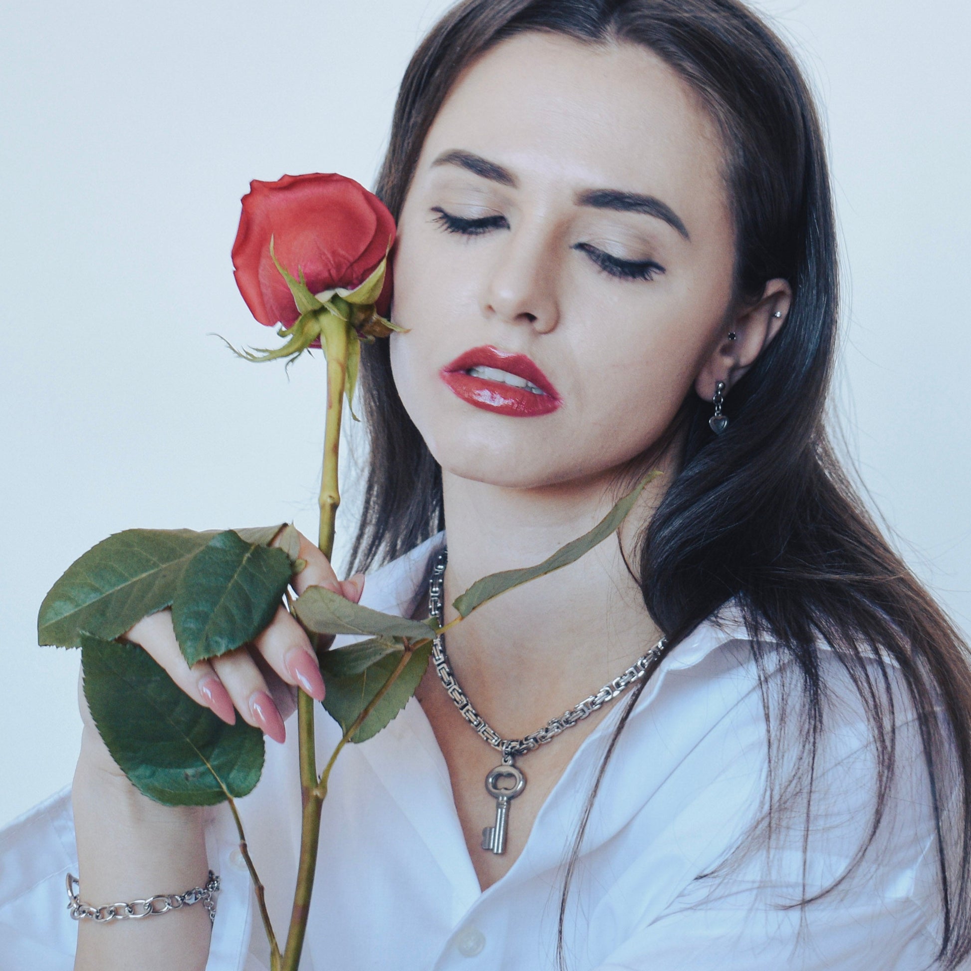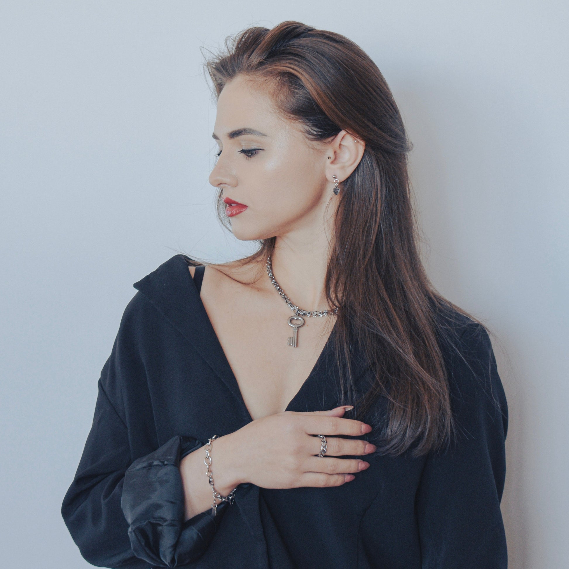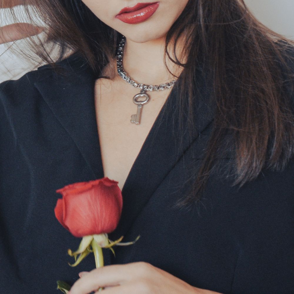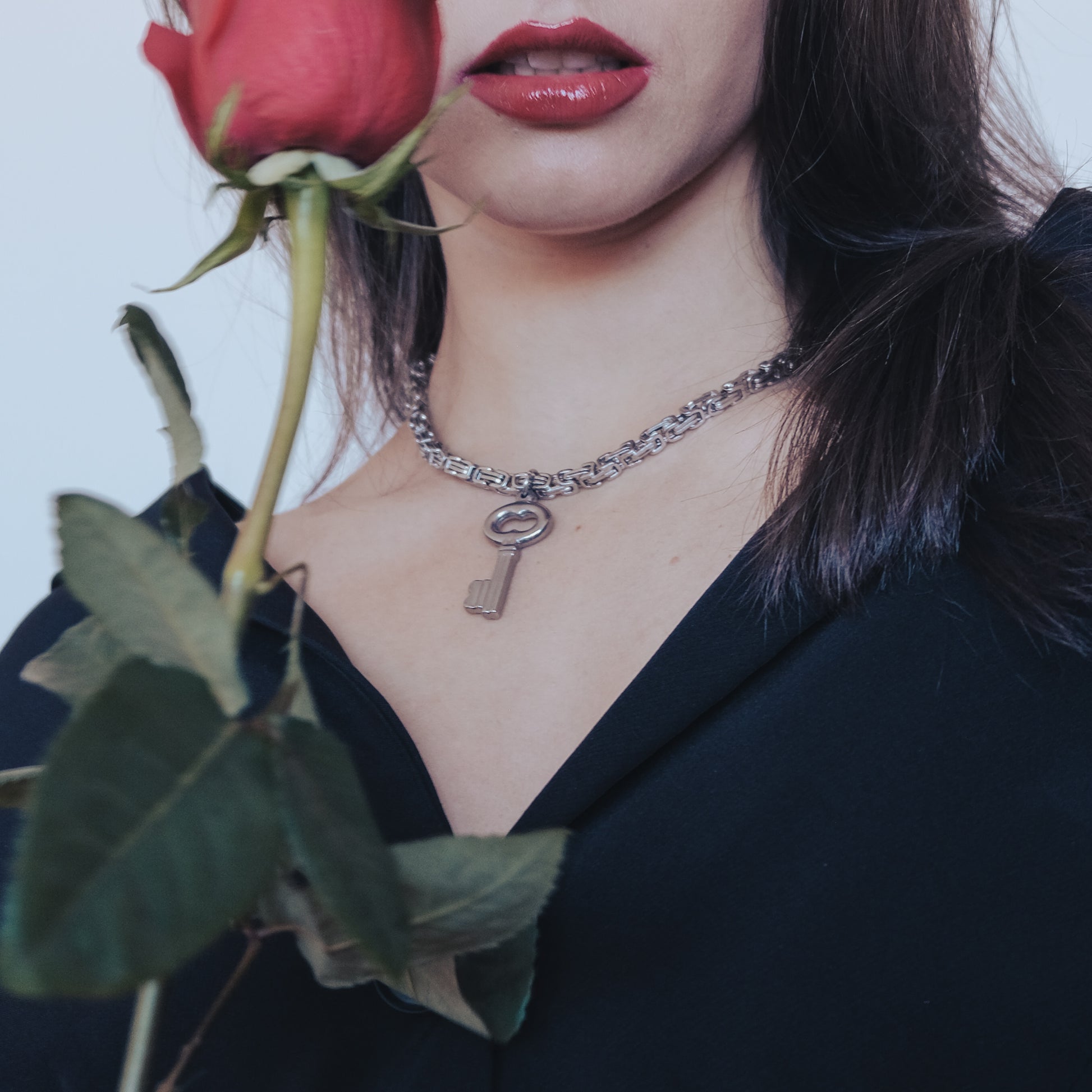 Introducing one of the must-have pieces from the Lock Hearts collection. This chunky, oversized key pendant is suspended on an intricate byzantine chain, symbolizing the complexities of unlocking one's heart. Will you trust someone special with the key to yours?