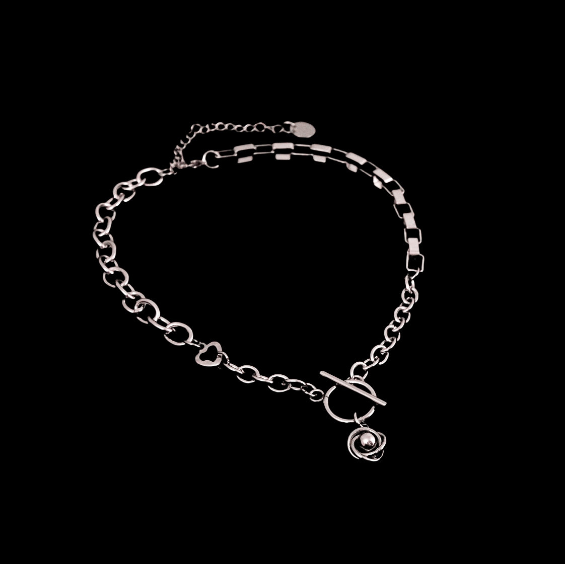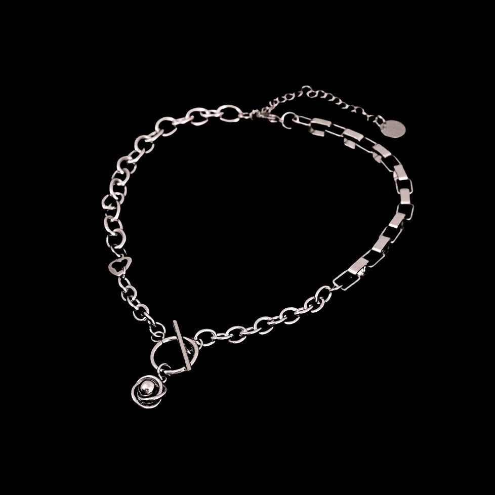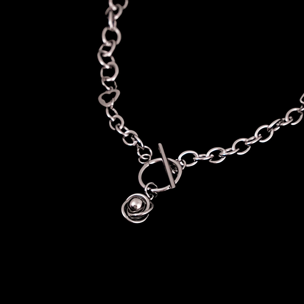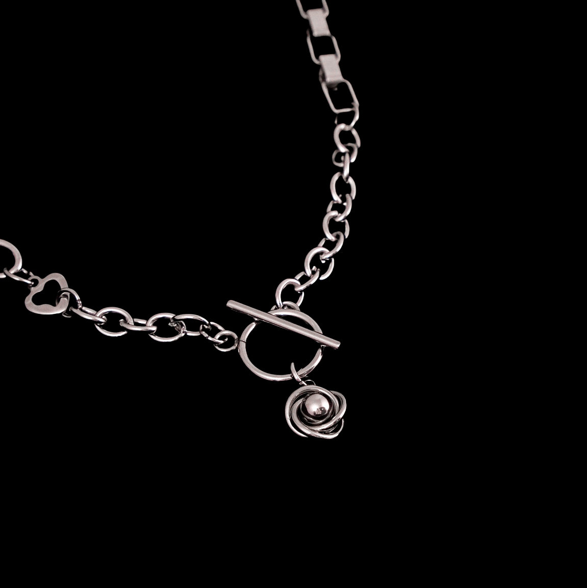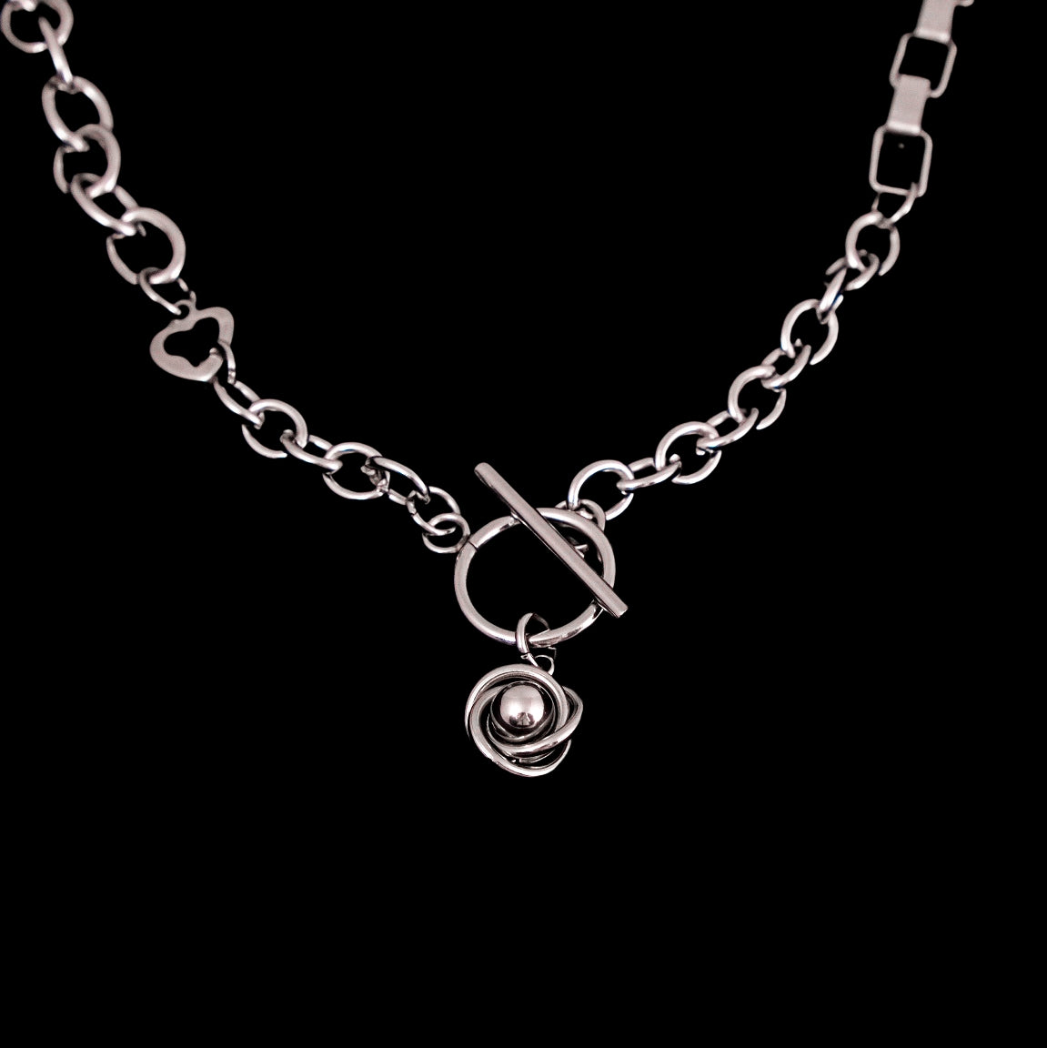 Introducing a one-of-a-kind necklace from the Lock Hearts Collection. This necklace features a combination of different shapes and sizes of chains. The centerpiece of the necklace is a rose-like pendant with rings that seem to be endlessly circling the center.