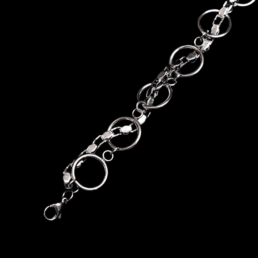 Explore your inner rebel with this experimental design. This mechanical silhouette features an unconventional layered construction of venetian chains looping through round toggles. Finished off with Labelstom's signature blank tags to signify limitless self-expression.
