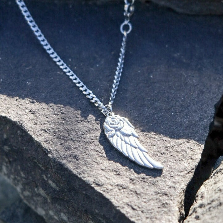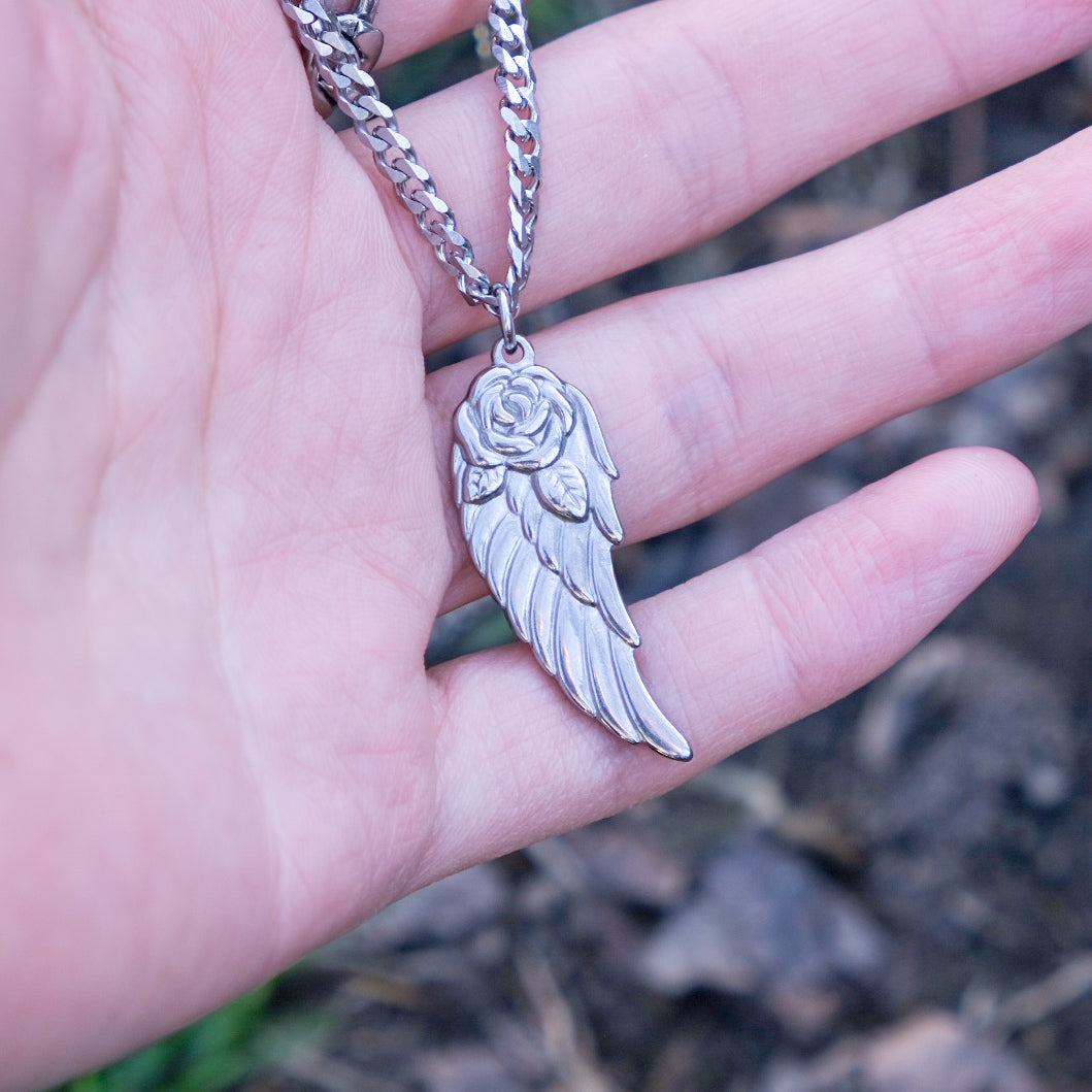 Unique wing pendant made with the combination of the rose and feathers. The symbol of courage, freedom, and spirituality. An everyday staple necklace that never gets boring.